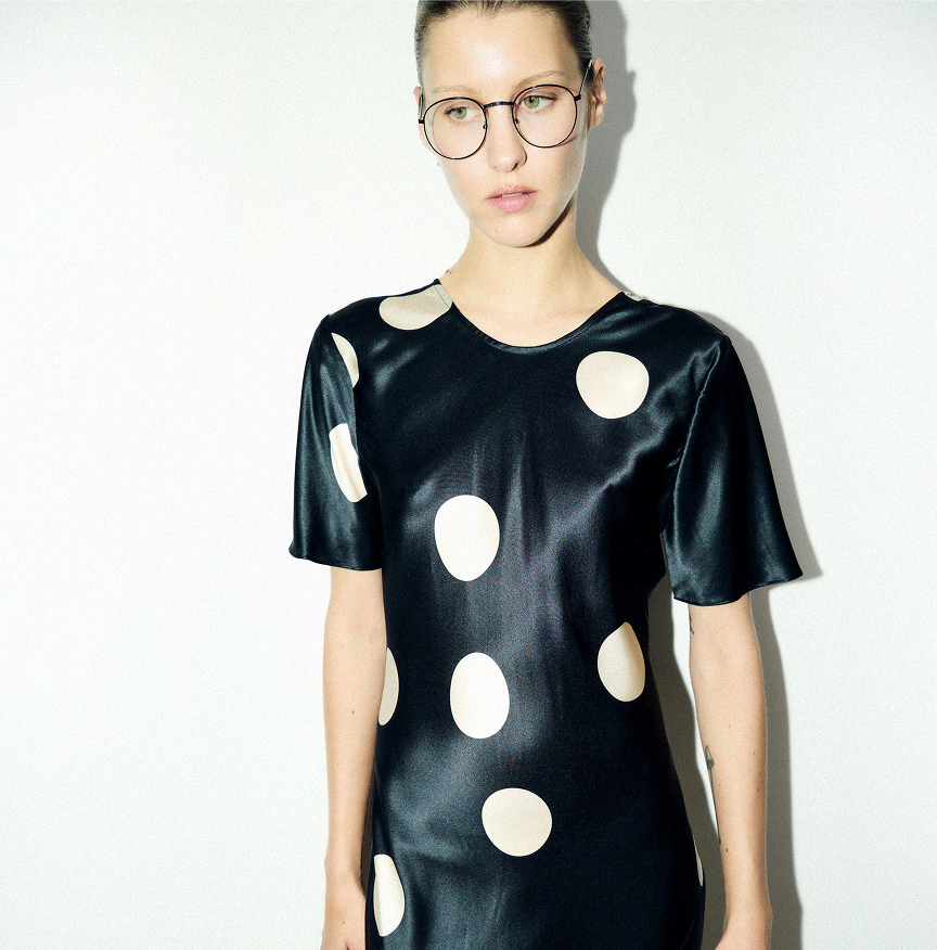 The polka dot was one of the very first Silk Laundry prints. It carries our history. This season, we bring it back — reimagined — in a classic small-scale polka dot featuring hazelnut dots on a black background.