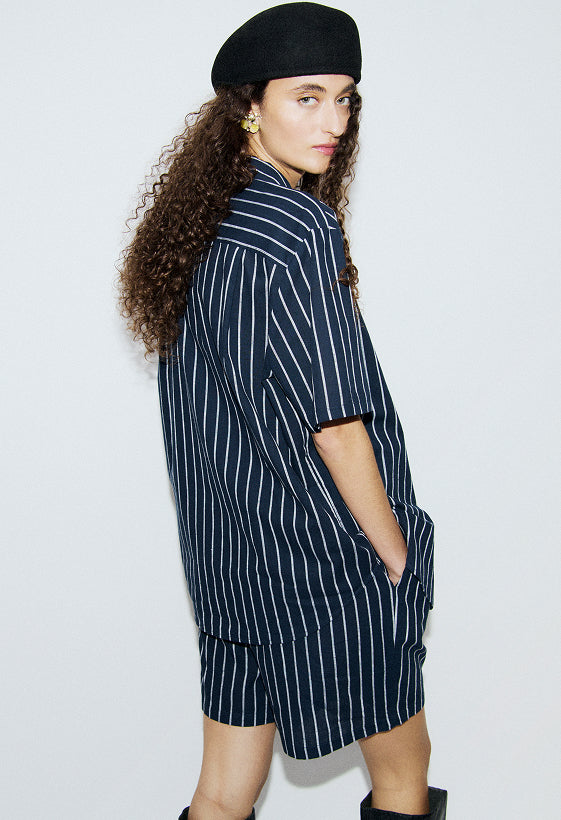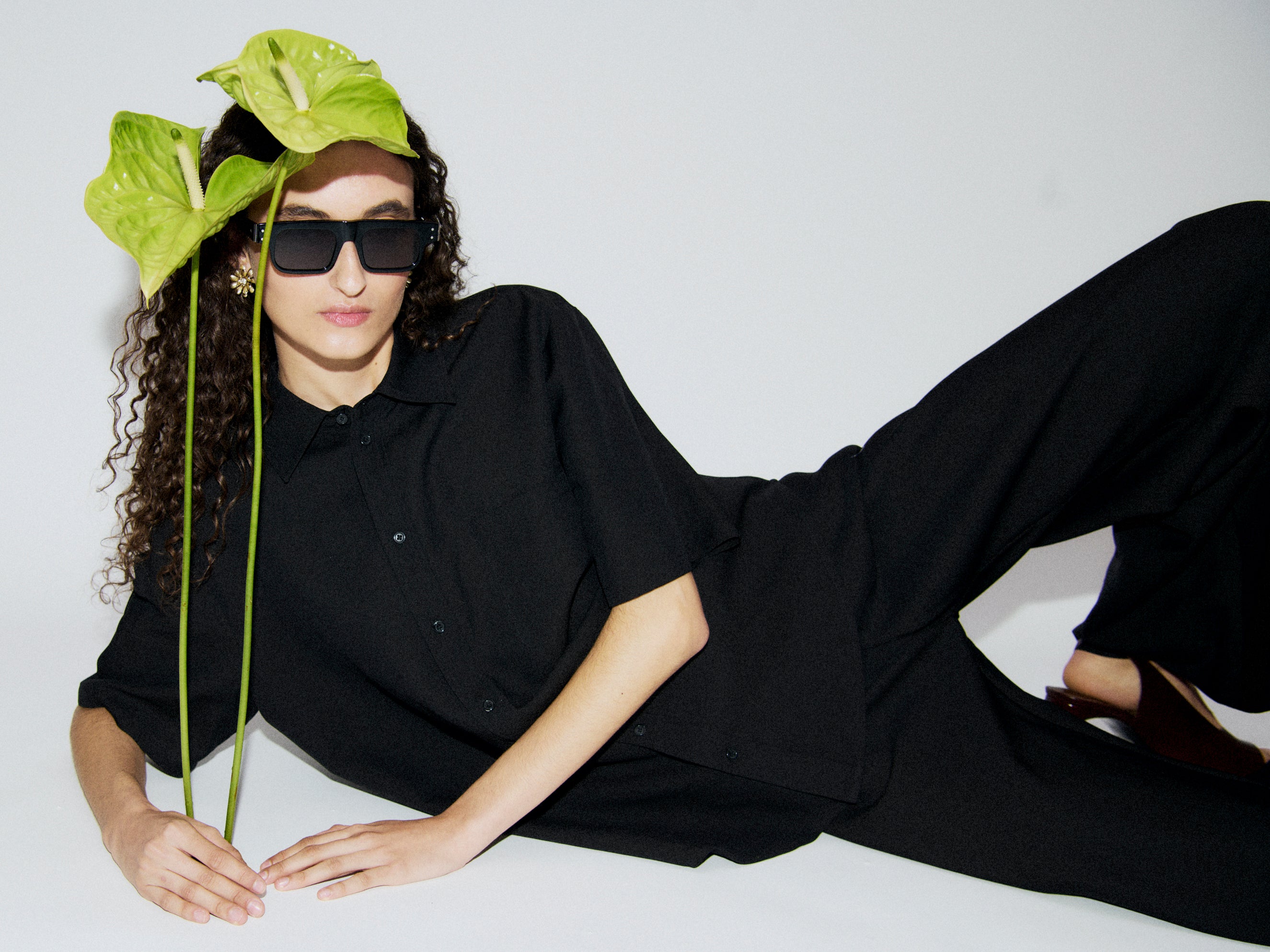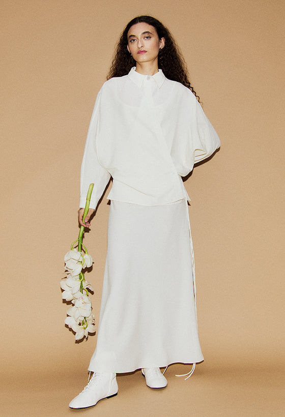 Crossover Shirt. Wool–silk with a soft, structured finish, designed with a cross-over front that can be styled multiple ways.