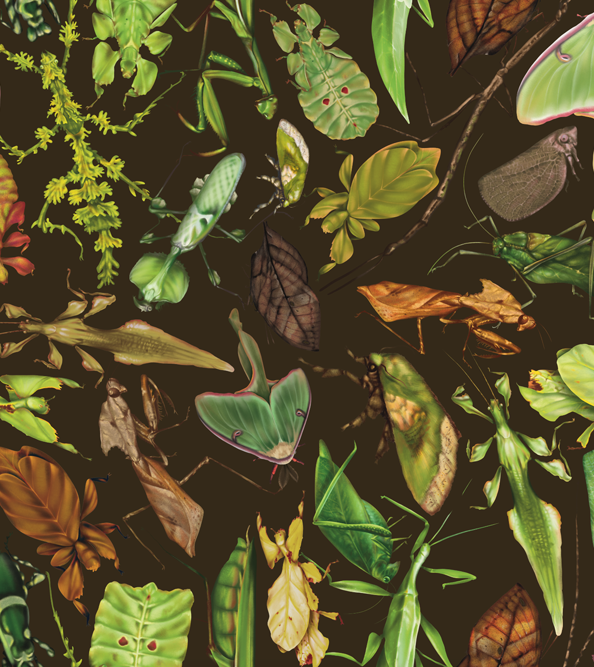 Bug Camo. A camouflaged pattern inspired by insects that transform themselves into leaves and shadows. A mix of real and imagined creatures.